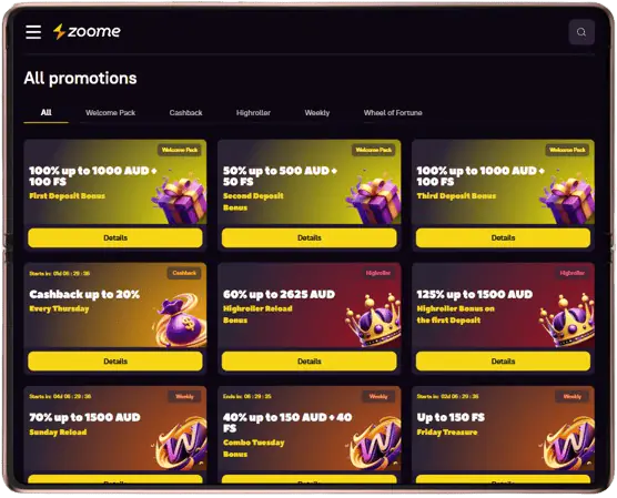 In this section, we’ll walk you through the Zoome app on Android and iOS platforms. Starting from our vast game library, which covers pokies, table games, and live dealers, all arranged under easy-picking categories. It does not matter whether you use iOS or Android. Our app works across all operating systems with flawless delivery and access to:
